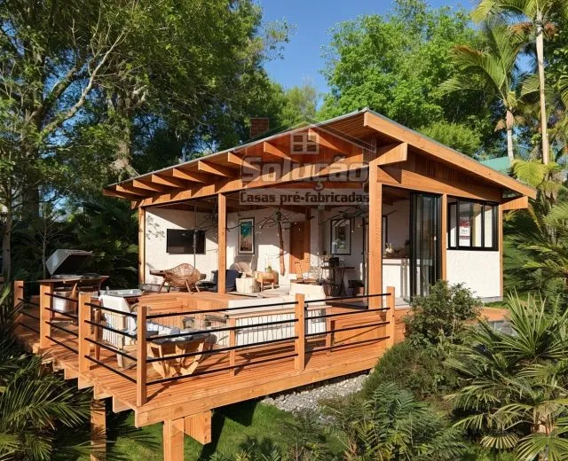 Nossas casas são mistas, com madeira de lei maciça e alvenaria, sendo a maior parte em madeira, 75%, e as áreas de alvenaria (banheiros, cozinha, fundação e área de serviço) ficam por conta do comprador. Confira abaixo mais detalhes: